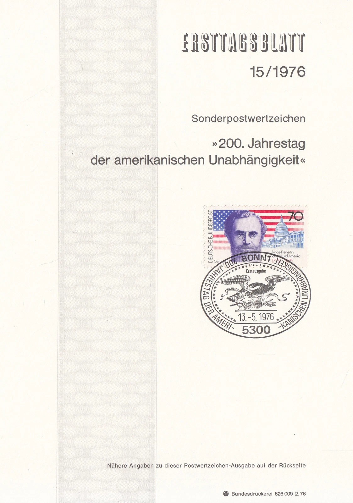 Auf der Rückseite des Ersttagsblattes mit der Nummer 15/1976 gab es dazu auch einen längeren Erklärungstext, für den das Auswärtige Amt in Bonn verantwortlich zeichnete. Ein Autor bzw. eine Autorin wird leider nicht namentlich genannt. In dem Beitrag wird nicht auf die Unabhängigkeitserklärung eingegangen, sondern das Leben des "wohl bedeutendste(n) Deutsch-Amerikaner(s)" gewürdigt. Nach dem einleitenden Absatz zur gescheiterten Revolution von 1848/49 heißt es dort weiter: